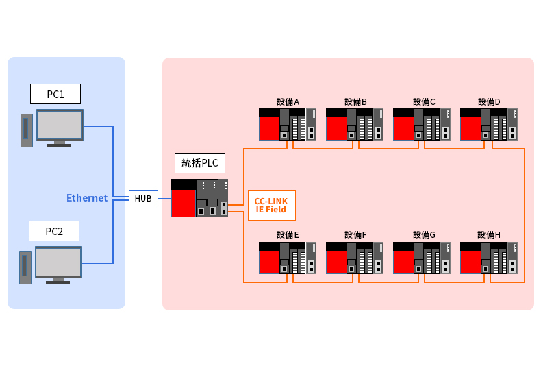 生産情報はEthernetベースの高速大容量通信ネットワーク CC-LINK IE Fieldを経由して各生産設備PLCから収集します。