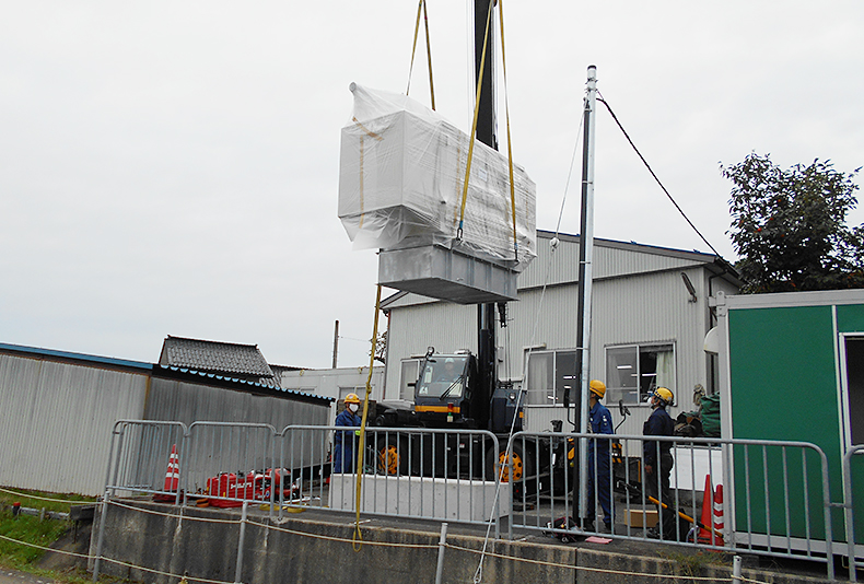 発電機をレッカーで吊り、基礎に据付ます。